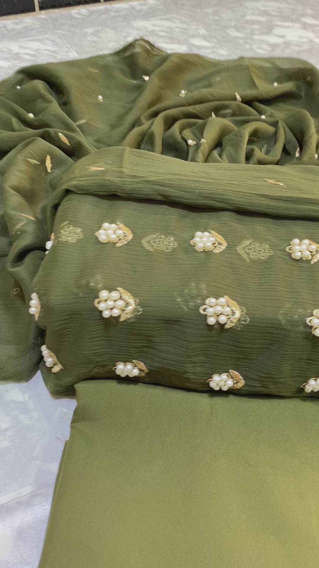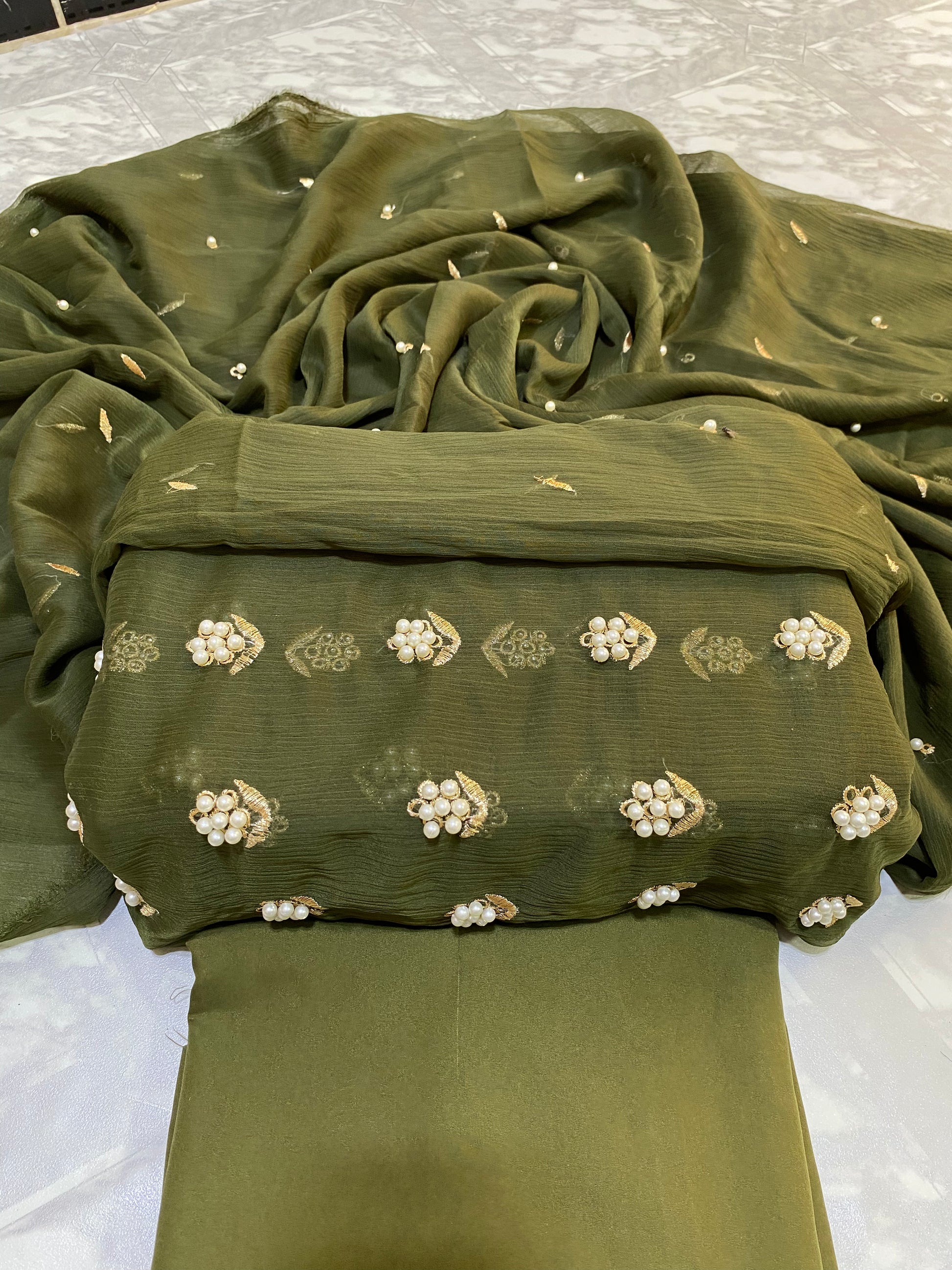 7pearls Premium Soft Chiffon 3pcs UNSTICH Dress ✨(OLIVE GREEN)