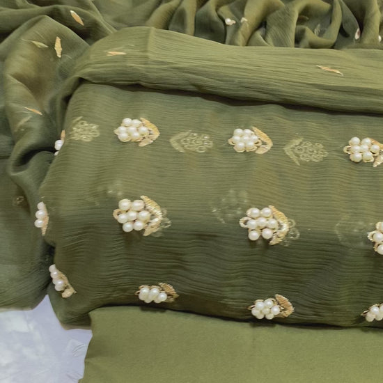 Collection 2025Premium 3-piece soft chiffon suit designed for a graceful festive look. – Front: 1.25 yards with 7 embroidered pules– Back, sleeves & dupatta: 4.25 yards chiffon with pearl and golden work– Trouser: 2.5 yards soft malai– Long shirt can be easily stitched Perfect for weddings, events