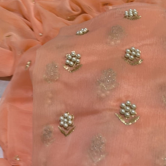 Collection 2025Premium 3-piece soft chiffon suit designed for a graceful festive look. – Front: 1.25 yards with 7 embroidered pules– Back, sleeves & dupatta: 4.25 yards chiffon with pearl and golden work– Trouser: 2.5 yards soft malai– Long shirt can be easily stitched Perfect for weddings, events