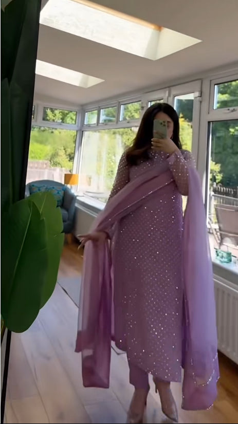 Introducing the stunning "Twilight Sparkle" ensemble, a luxurious three-piece set designed to dazzle. The shirt is crafted from pure chiffon with a bember finish and features intricate crystal work all over for a radiant, sparkling effect. The matching dupatta boasts heavy crystal detailing with a double border, enhancing its elegance. The premium quality dyed malai trouser ensure a comfortable and sophisticated fit.